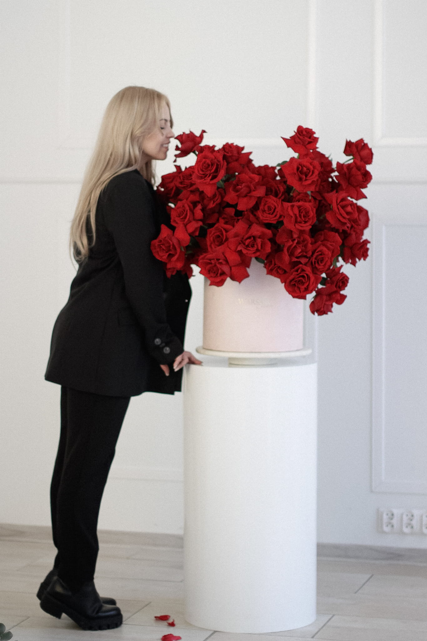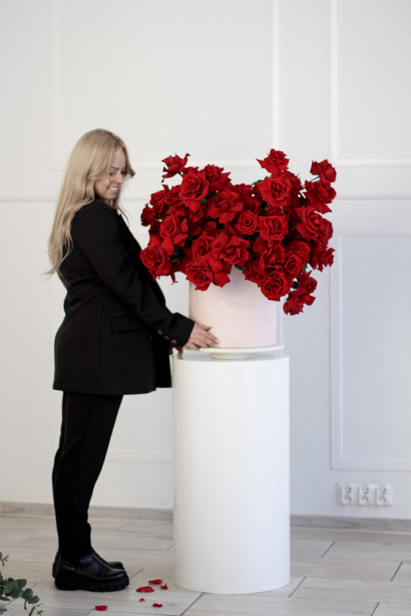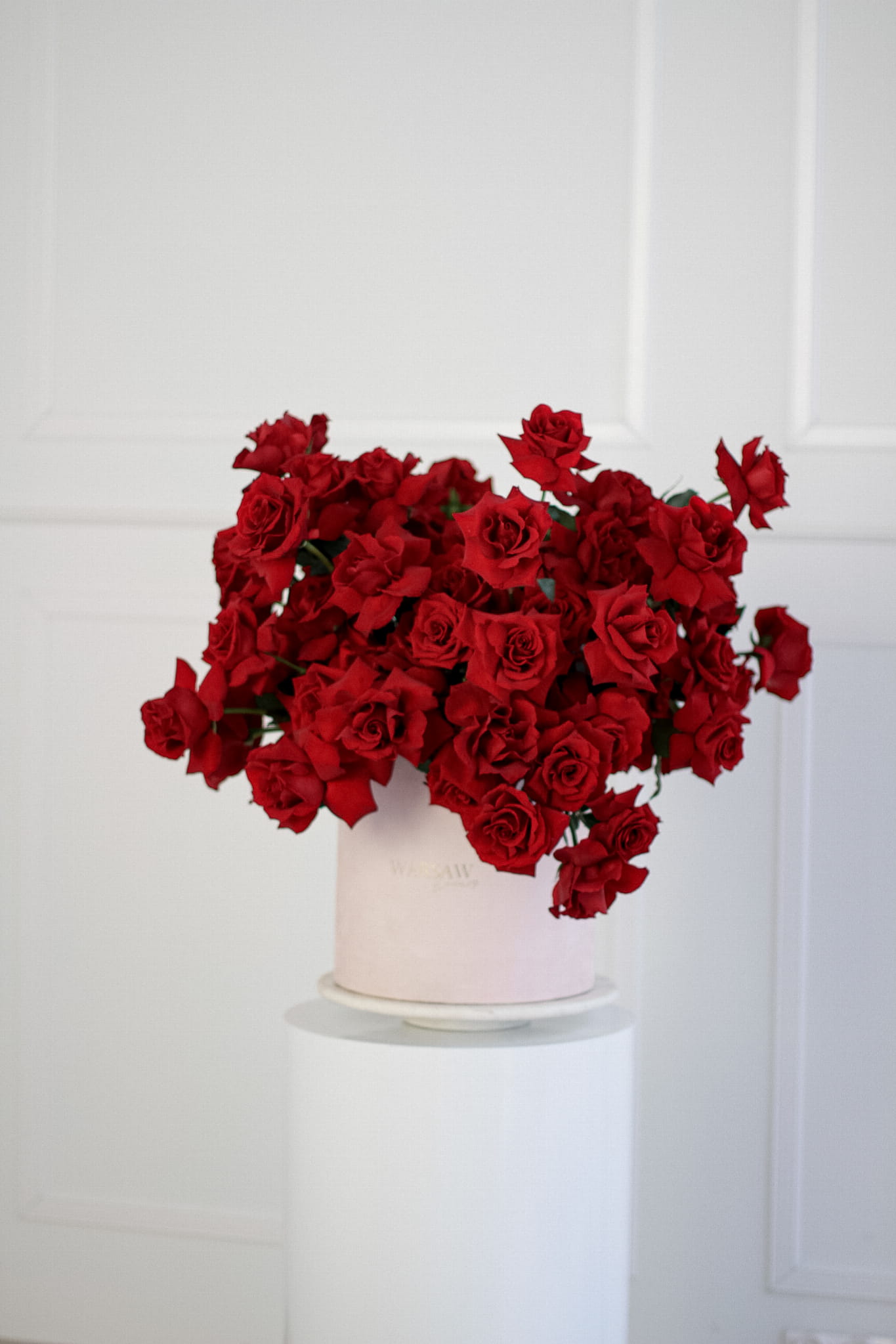 Flowerbox jest wykonany z ręcznie wywijanych czerwonych róż (75 szt.) w nowoczesnej, asymetrycznej formie