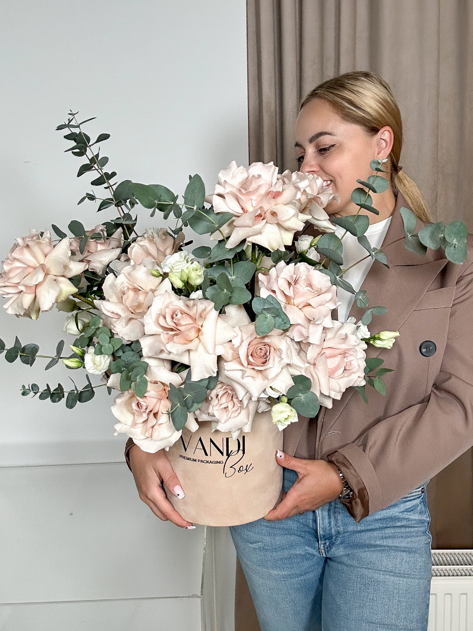 Flowerbox jest wykonany z ręcznie wywijanych beżowych róż Quicksand z dodatkiem pachnącego eukaliptusa.