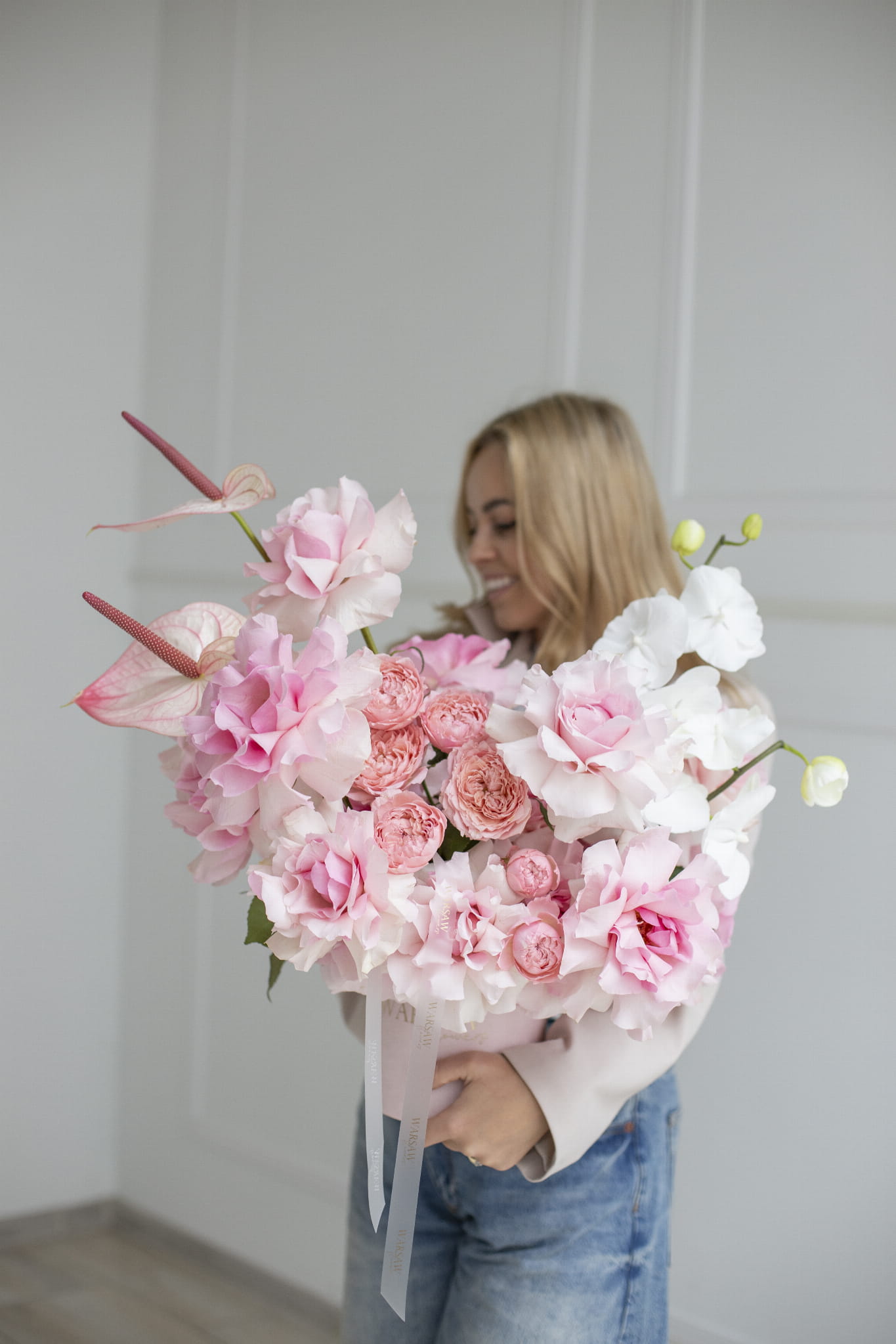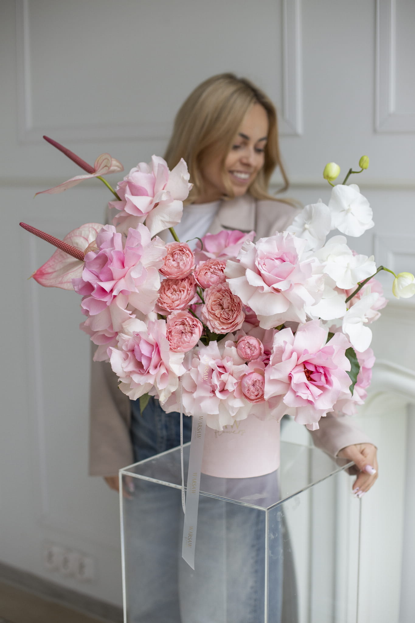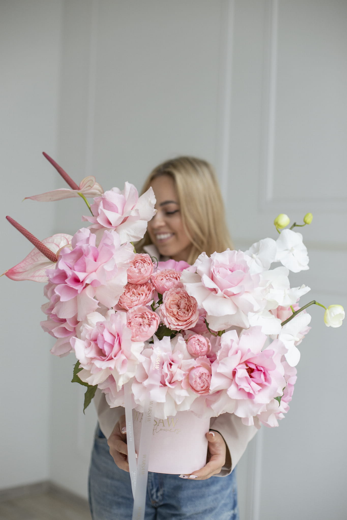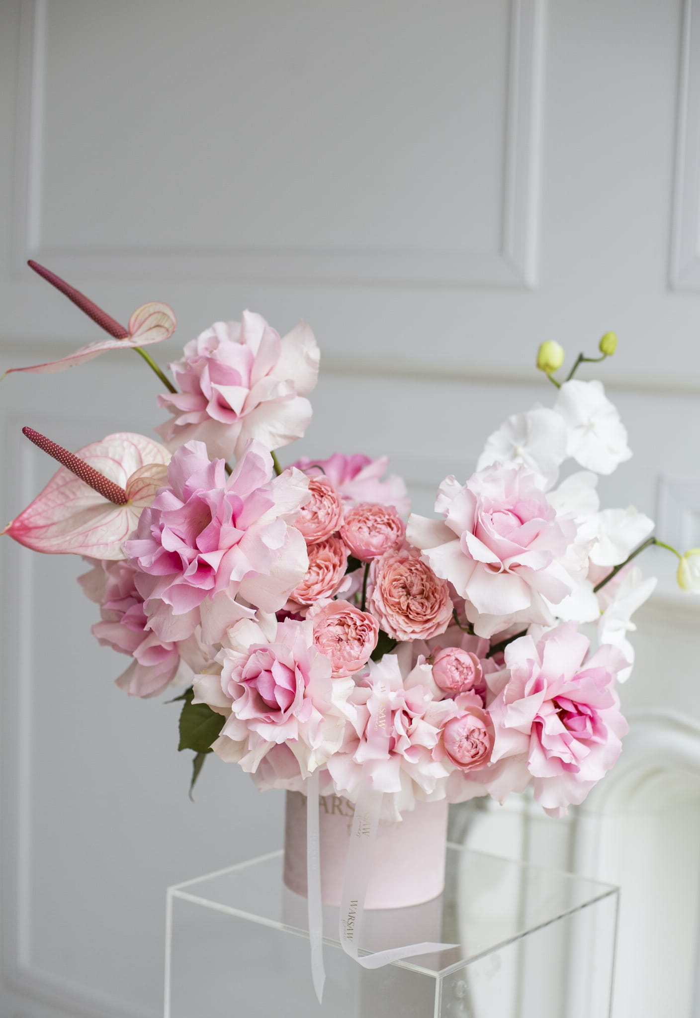 Flowerbox jest wykonany z ręcznie wywijanych róż z dodatkiem różowego anturium oraz innych kwiatów w pudrowo różowej tonacji.