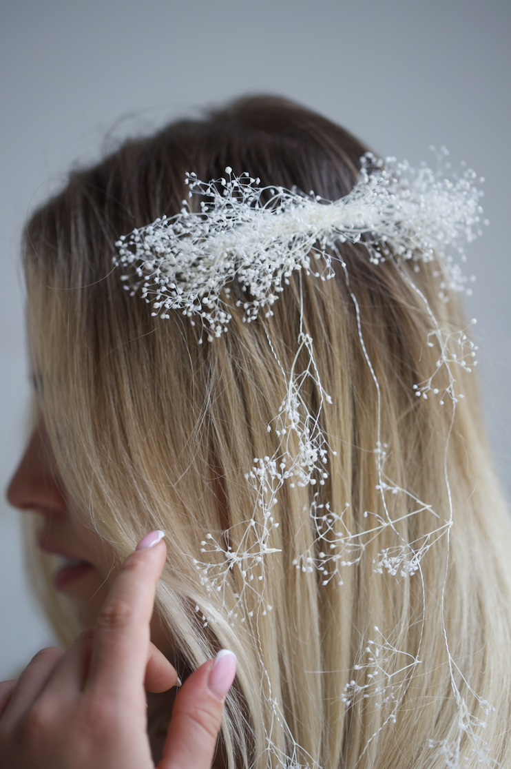 Ozdoba do włosów wykonana jest na plastikowym grzebyku z przymocowanymi opadającymi pojedynczymi gałązkami gipsówki na srebrnym druciku ozdobnym