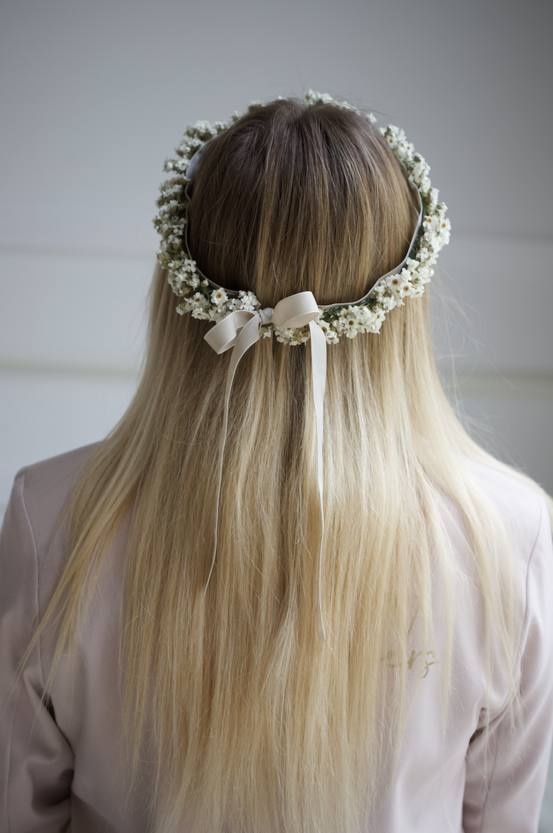 Delikatny, naturalny wianek wykonany z suszonej naturalnej oxodii to idealna propozycja na dopełnienie komunijnej fryzury oraz podkreślenie wyjątkowości I Komunii Świętej