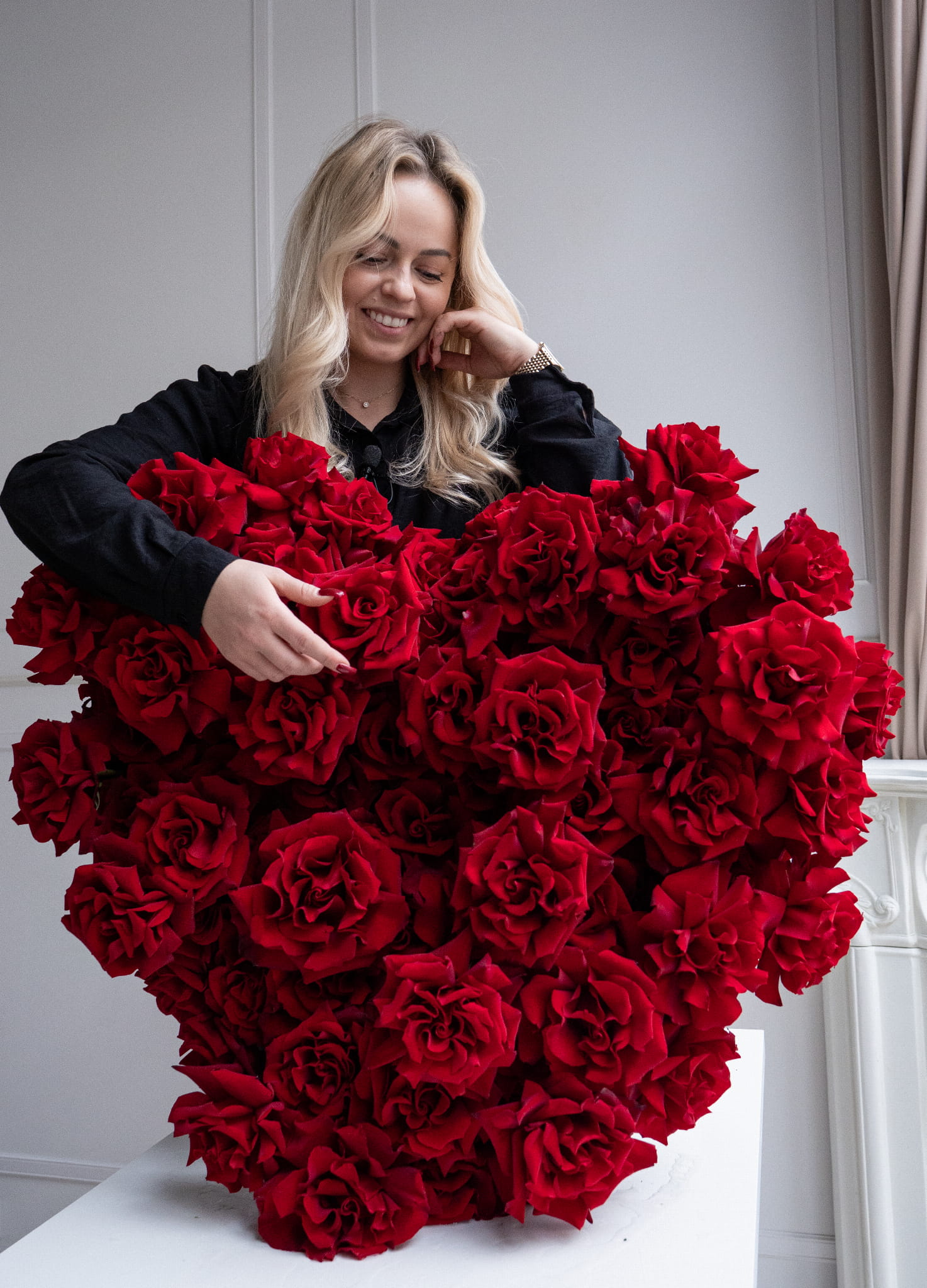 Serce GIGANT z ręcznie wywijanych róż (100 szt.) w odcieniu głębokiej czerwieni.
