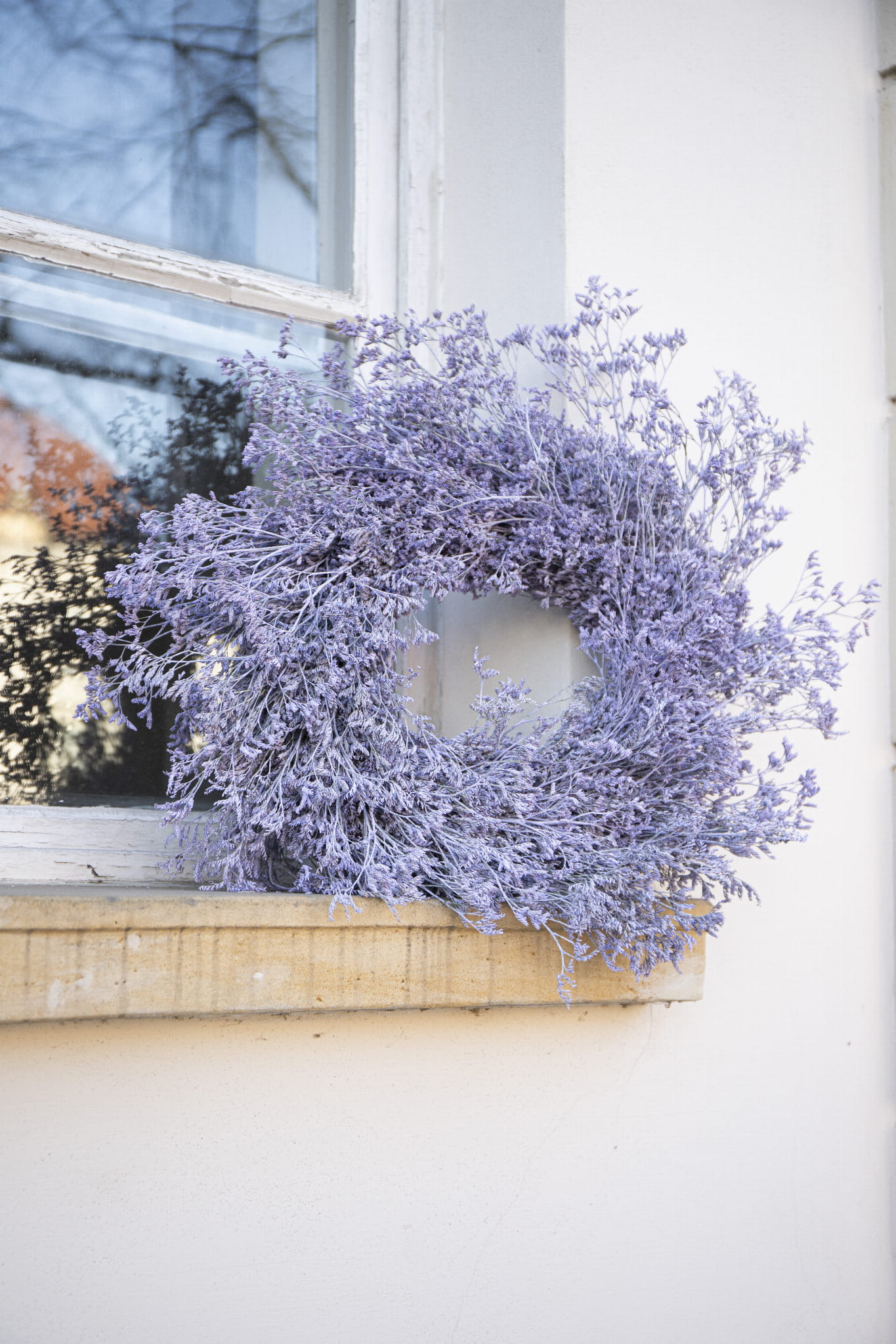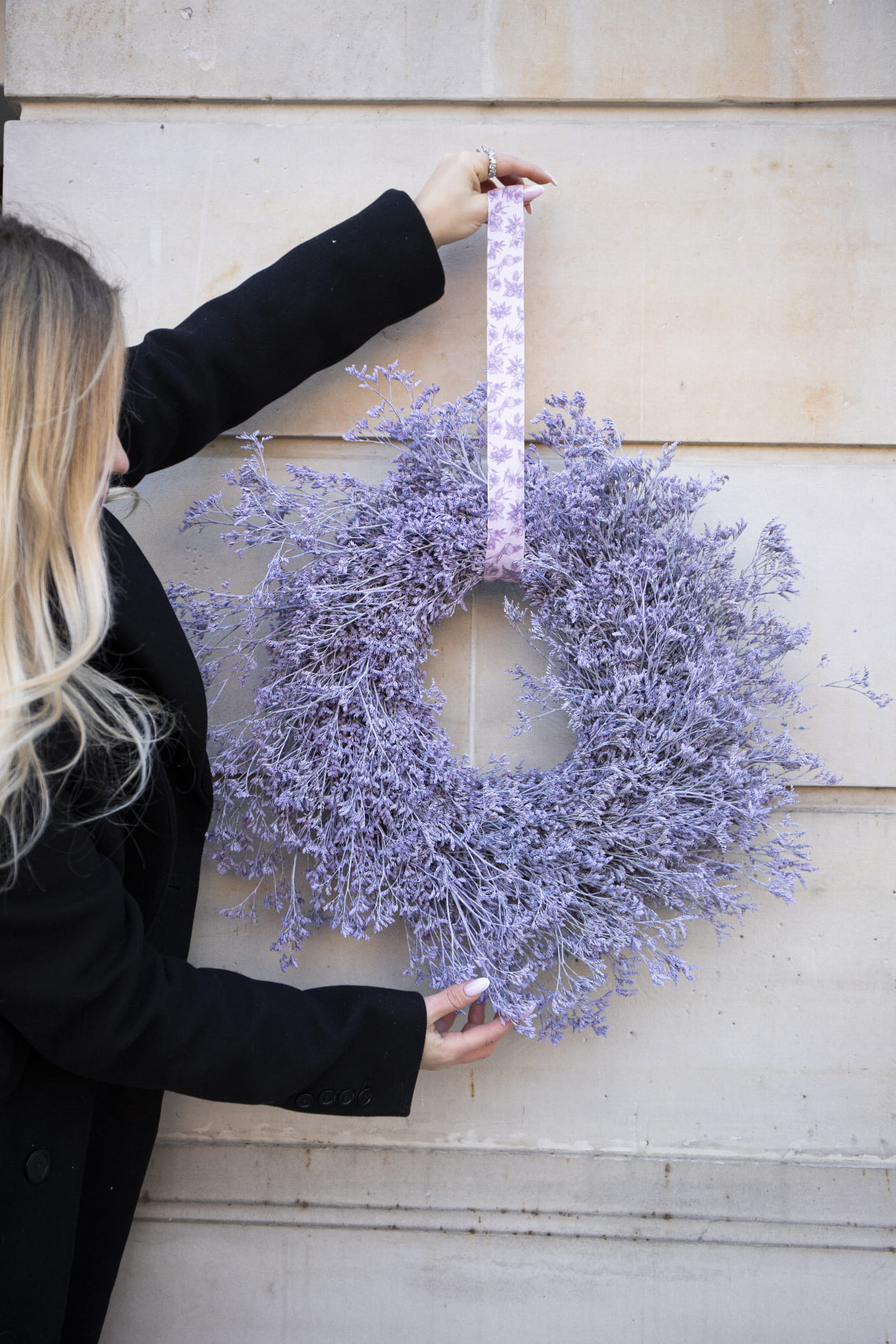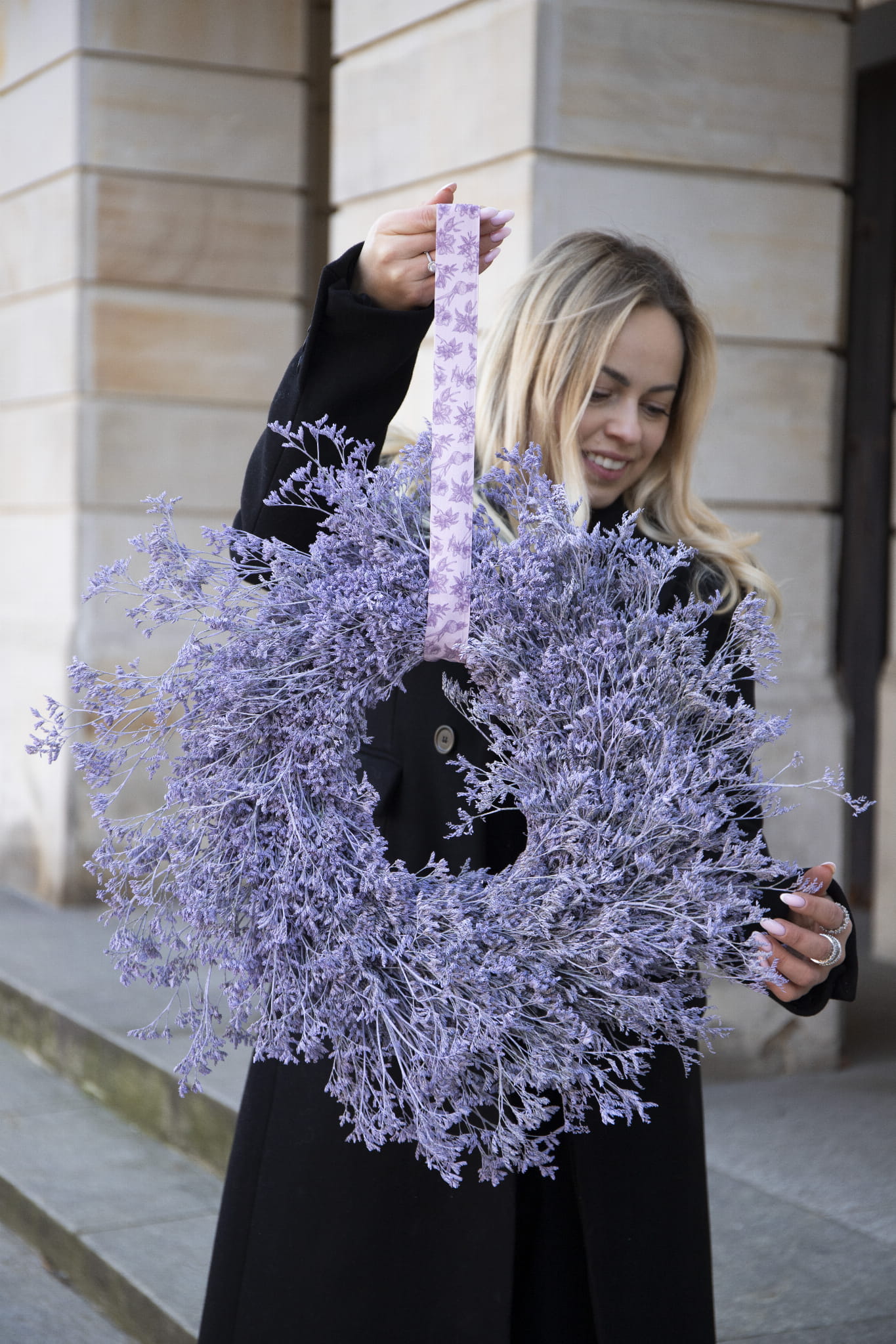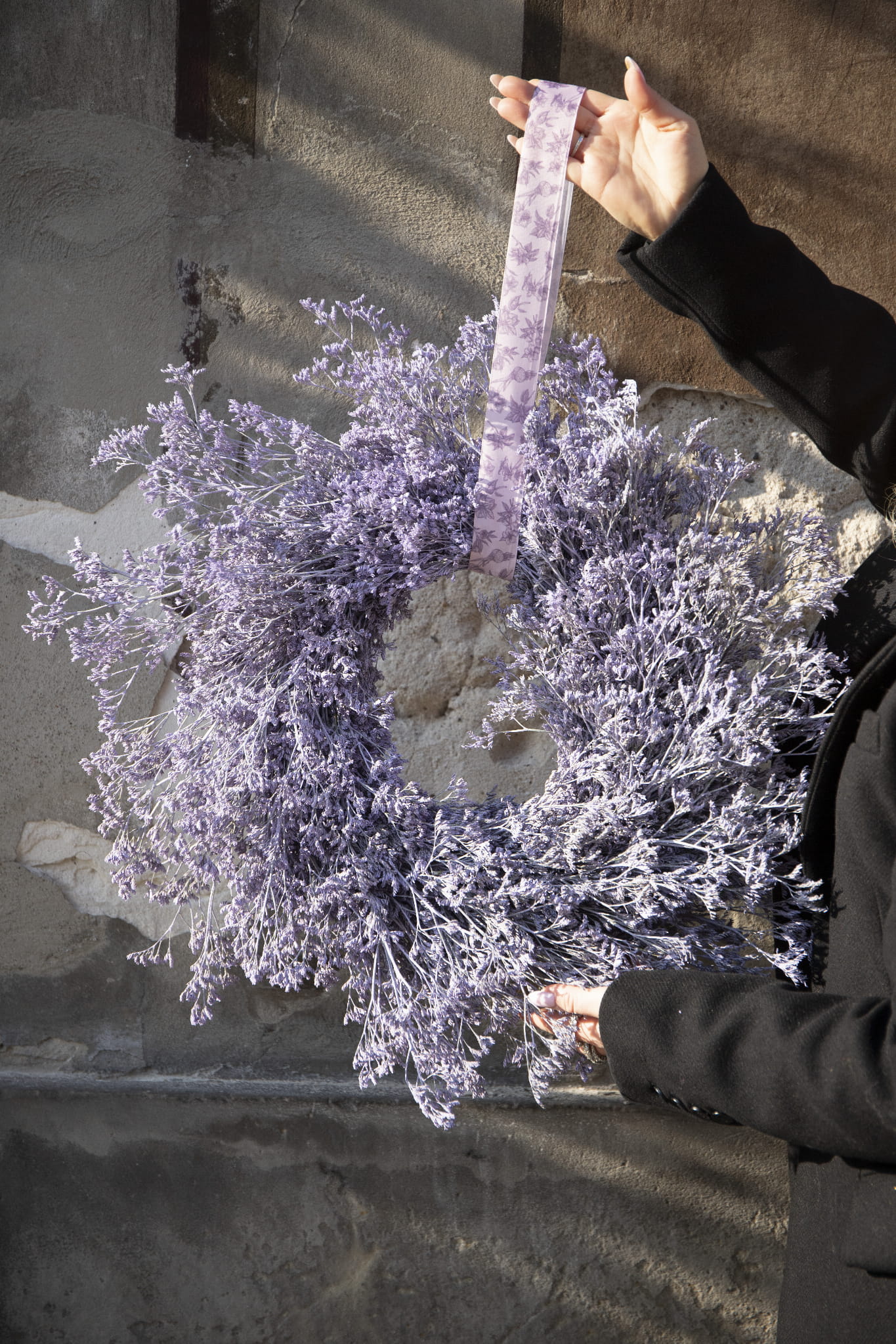 Zwiewny a jednocześnie niezwykle puszysty wianek wykonany z limonium w zachwycającym wrzosowym kolorze. Uroczy, radosny i bardzo trwały