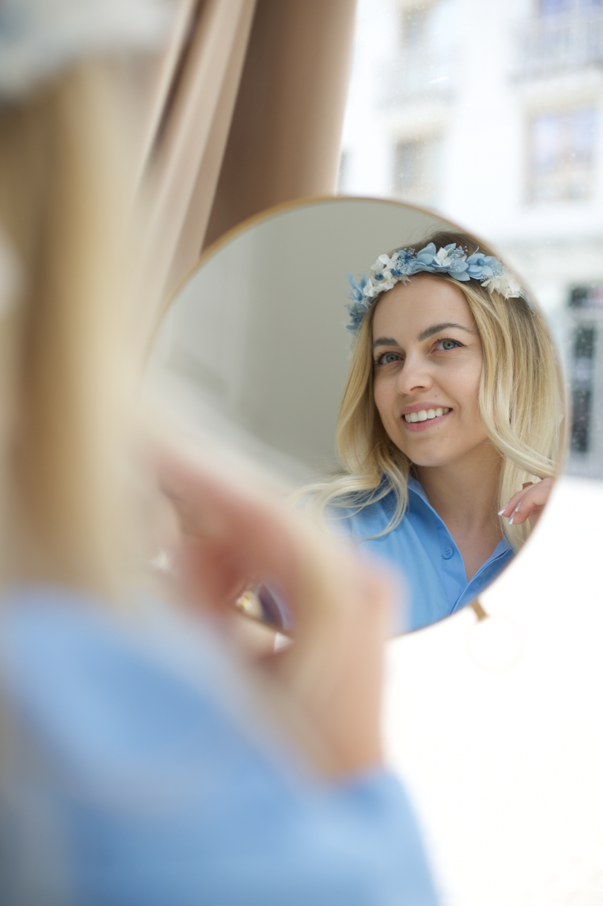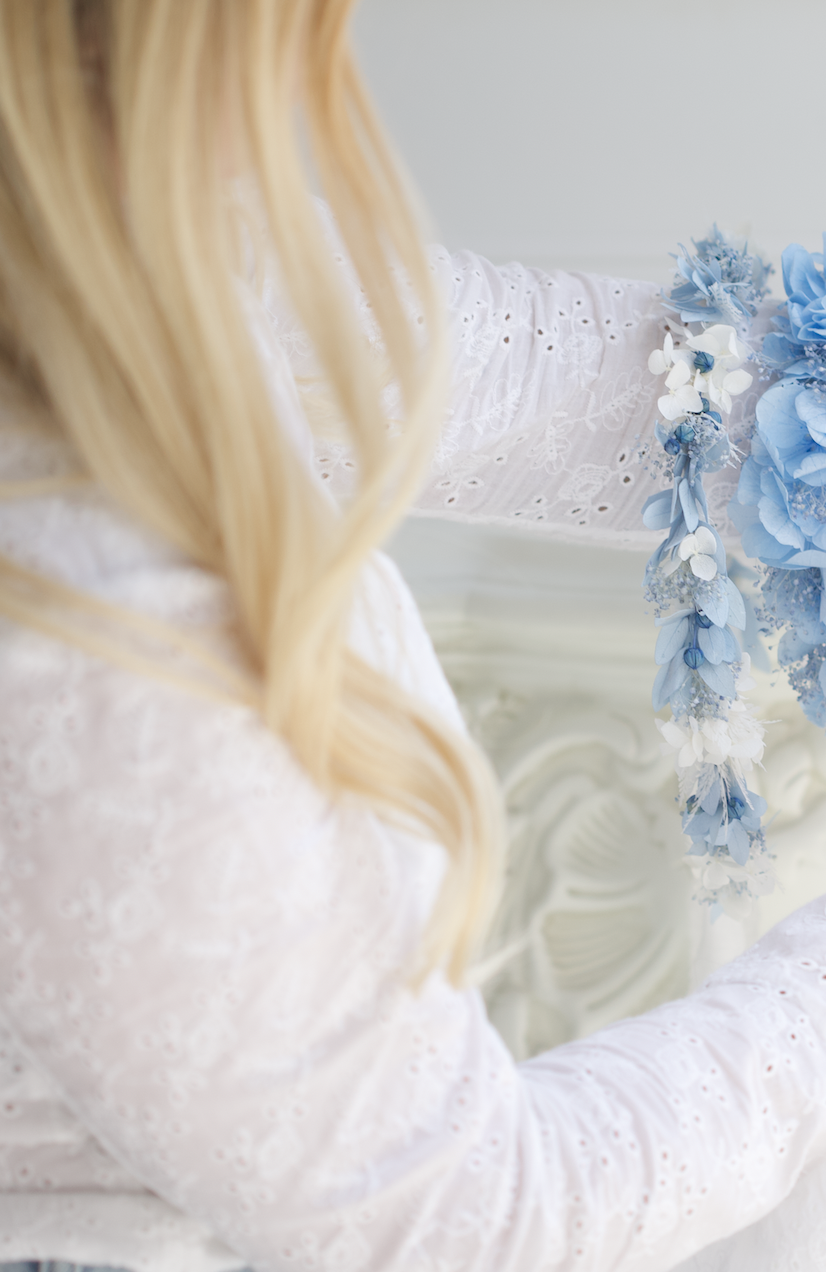 Uroczy, niebiański wianek wykonany ze stabilizowanych kwiatów w biało-błękitnej tonacji